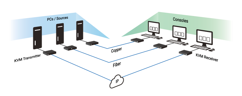 High-Performance Virtual Machine AccessVirtual machine (VM) based server infrastructure is a well-established technology that helps saving costs for computer hardware and maintenance as multiple machines can be hosted on a single physical server. However, accessing these VMs through a Local Area Network still causes bandwidth issues and often lacks performance and the "real desktop experience". Modern KVM extenders solve this problem by providing fast access with native HD or even higher resolutions and transparent USB support. Like this, users can work on a virtual desktop in real-time as if it was a physical PC without affecting an organization's regular data network. Server Room and Server Farm ManagementServer rooms are designed for computers, not for people. They are chilly, dry, noisy places, often located out of the way and they also have strict security and fire control procedures. Whether an administrator needs access to a handful of servers, or to hundreds, a KVM extender can be interfaced to a KVM switch granting access to all servers from a comfortable and convenient location. Industrial Control and MonitoringA computer collecting industrial data or controlling industrial processes may be located in an area uncomfortable or hazardous to people. KVM extenders can be used to give control of these devices from a safe and comfortable distance. Fibre cabling may be used to provide protection against electronic emissions caused by production equipment.