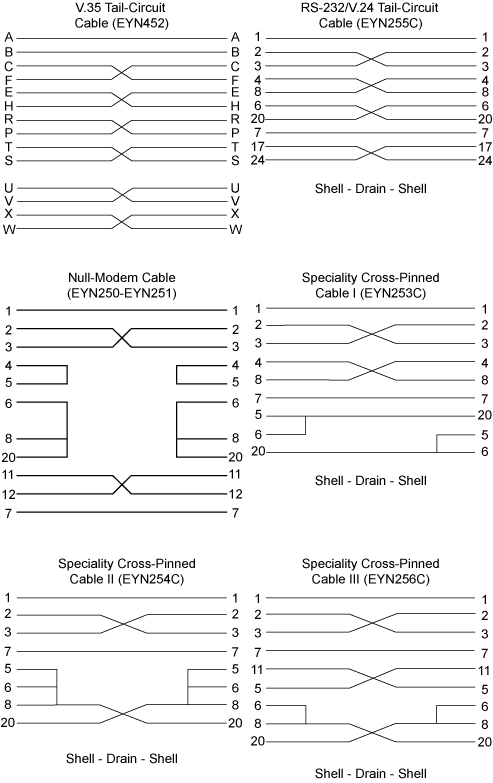 Pinning charts for Tail-Circuit, Null-Modem, and Cross-Pinned Cables